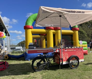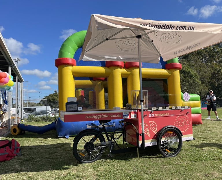 Space-Friendly Setup: No need to worry about space constraints. Our compact gelato carts fit seamlessly into small areas or large areas, whether it’s at an outdoor field, indoor stadium, or even a golf course. Florence our main roving electric bike gelato cart can run without power for up to 8 hours and holds up to 6 flavours! our team can serve over 1000 scoops a day if required.