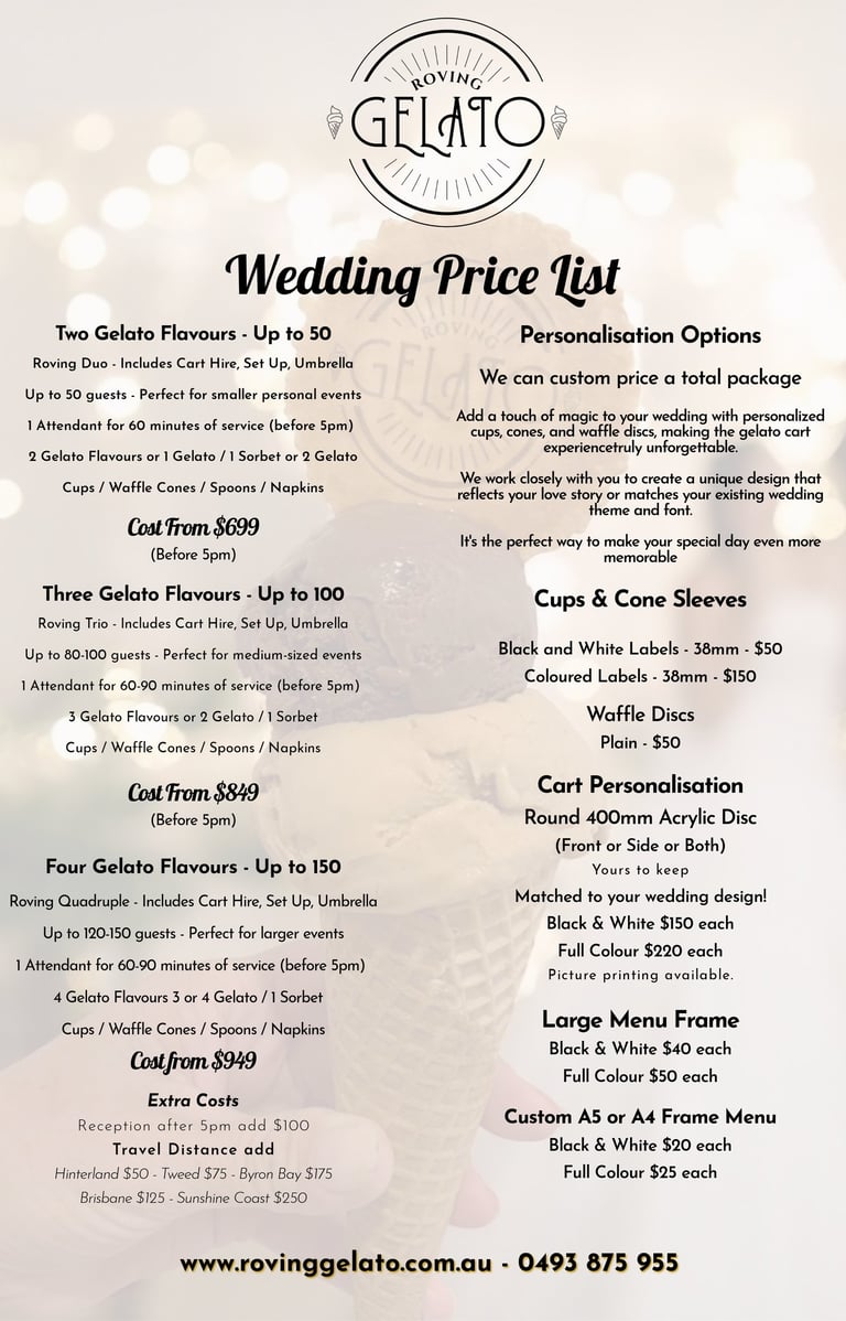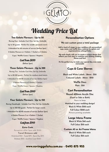Flexible Packages: Whether you’re wedding is for 10 or 200+ we’ve got you covered. Our standard packages typically run for 1 to 2 hours, allowing ample time for gelato enjoyment.