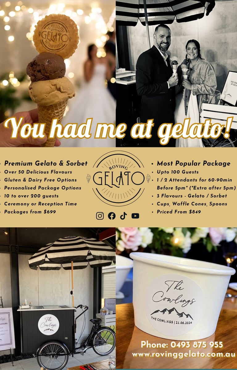 Delicious Treats: Our premium gelato and sorbet is a crowd-pleaser! From classic favorites like rich chocolate and refreshing mint choc chip to dairy & gluten free sorbets, we’ve got something for everyone. Your guests will savor every spoonful.