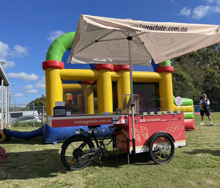 Space-Friendly Setup: No need to worry about space constraints. Our compact gelato carts fit seamlessly into small areas or large areas, whether it’s at an outdoor field, indoor stadium, or even a golf course. Florence our main roving electric bike gelato cart can run without power for up to 8 hours and holds up to 6 flavours! our team can serve over 1000 scoops a day if required.